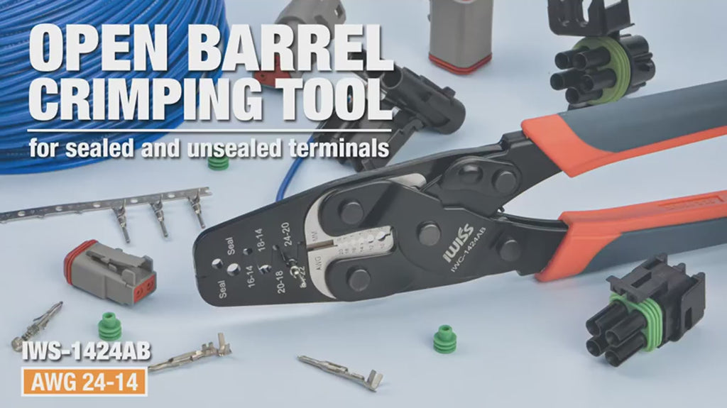 • IWC-1424ABは、IWS-1424A オープンバレルクリンパーとIWS-1424B ウェザーパッククリンパーを組み合わせたモデルで、さらにAWG20-10対応のワイヤーストリッパーとワイヤーカッターを内蔵したアップグレード仕様です。